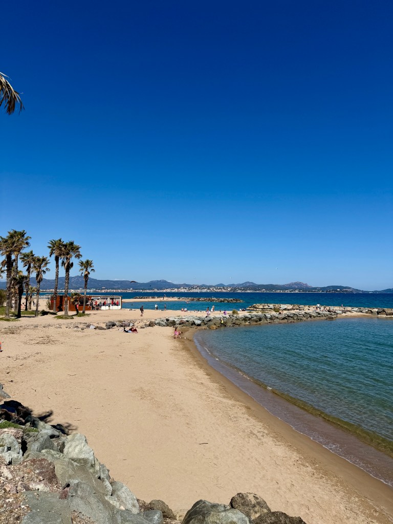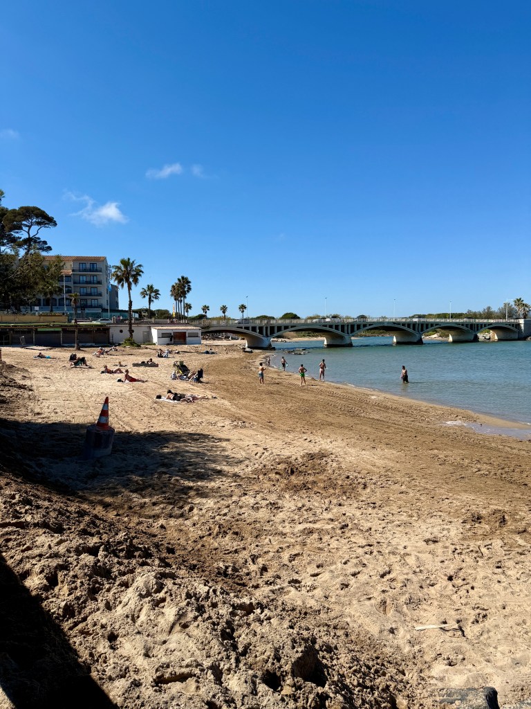 And then across the bridge over the river there is the long stretch of Plage de St Aygulf, fortified by stone groins into little bays for about a mile of unbuilt up land to the river Argens and the town of Frejus beyond….