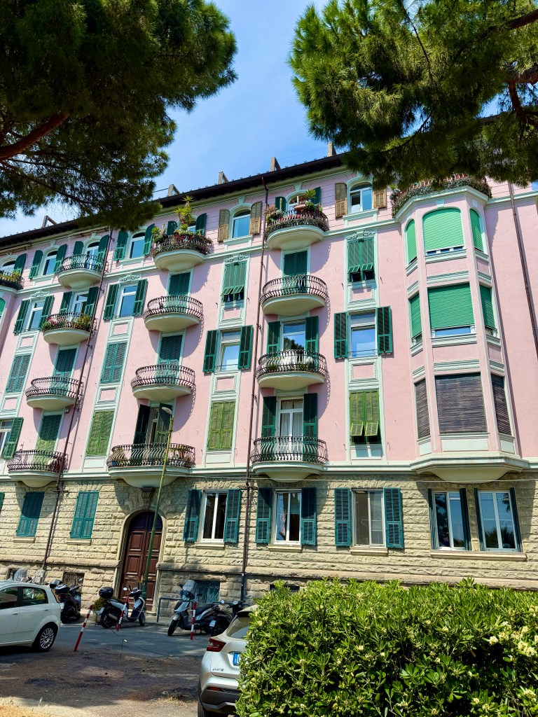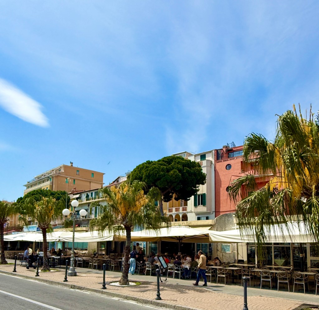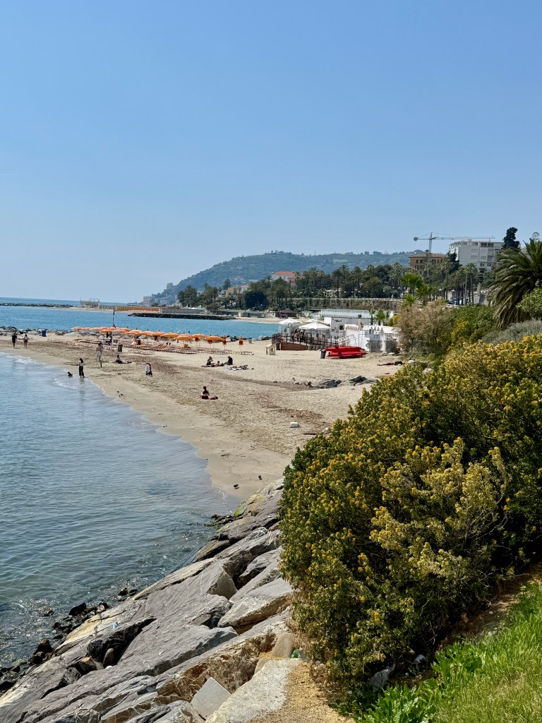 Another beautiful day and for us a day trip to Sanremo. We took a short walk up into the main village of Vallecrosia and then it was just a 10 minute train journey into the heart of Sanremo – ideal plan. From the station it was another short walk down onto the sea front where we turned left (eastwards) along the promenade, passing the marina to the furthest beach – a rather stony and scruffy small beach (not dog friendly) – Spiaggia San Martino….