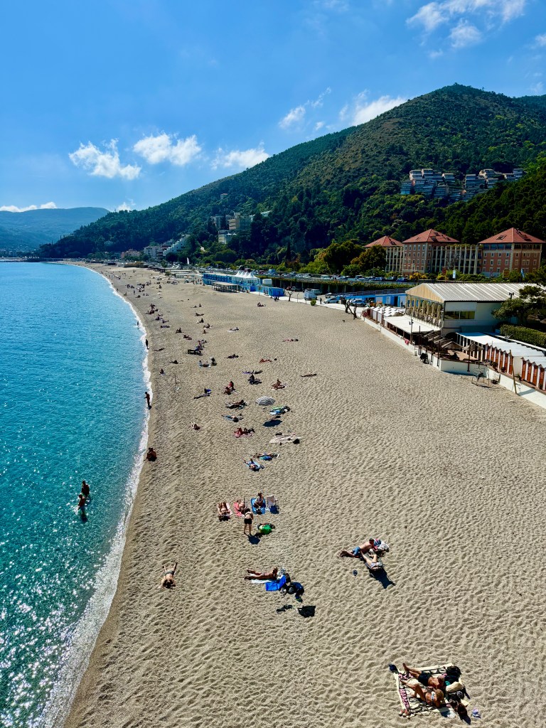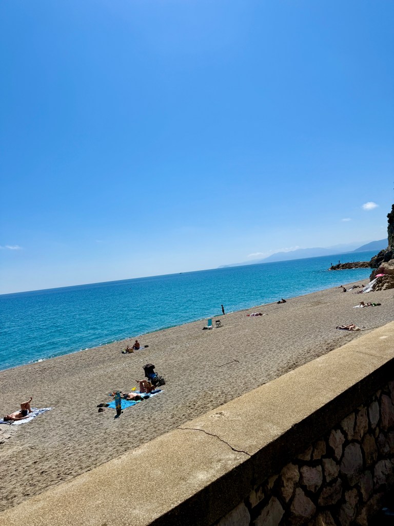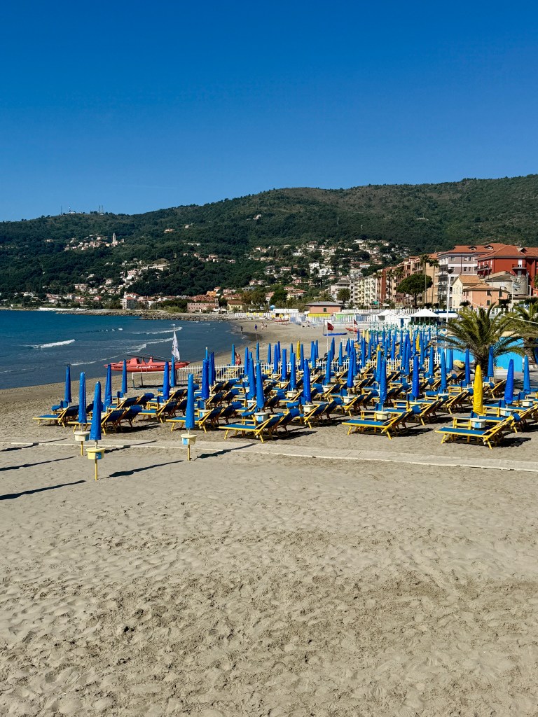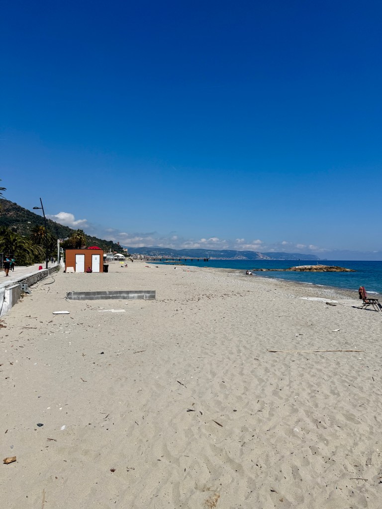 Our next stop was Ceriale (Albenga was too busy and chaotic!) where we were a little bit cheeky, in so far as we pulled into an out of town supermarket, did some much needed shopping and then left the van for an hour or so to wander down to the coast. We took a quick look at a campsite that we were contemplating for a few days – no chance as the only access was via a railway bridge with a height restriction of 2.3m – a fairly typical issue along this stretch of coast as the SS1 coastal road and the railway vying for pole position next to the sea. Also disappointingly the railway runs right next to the beach and so access and views are restricted for much of this section (glad we didn’t opt to stay here). When we did get into Ceriale and to the beach the views were non existent from their nice new (still under construction) promenade by private bars and changing sheds etc….
