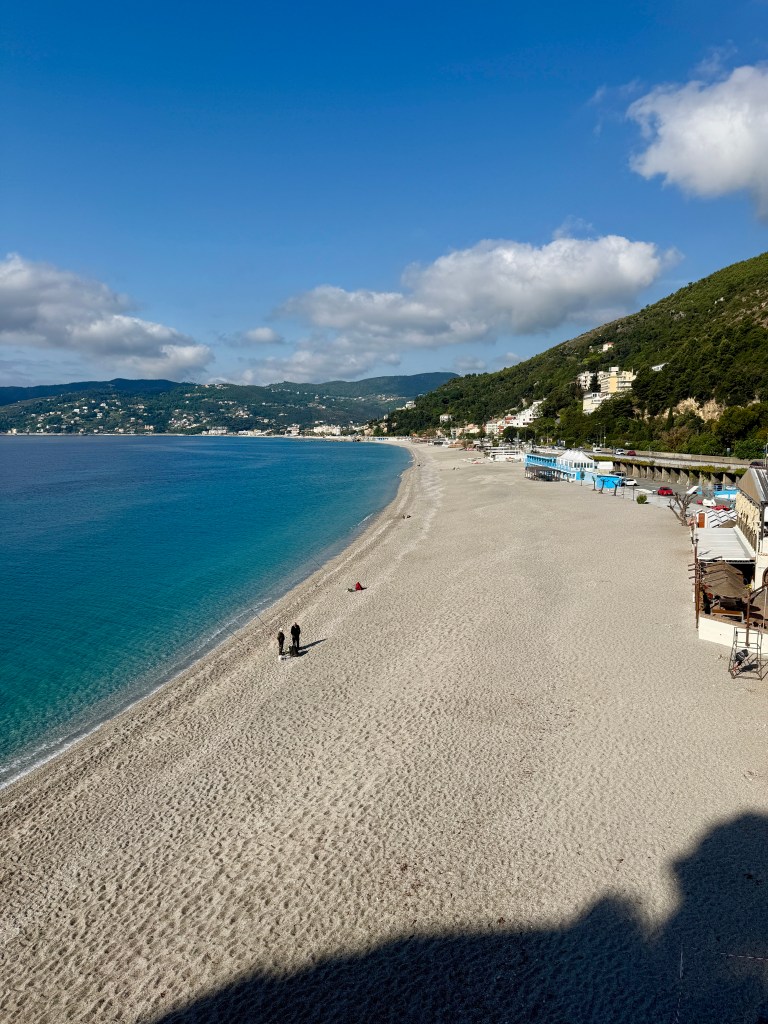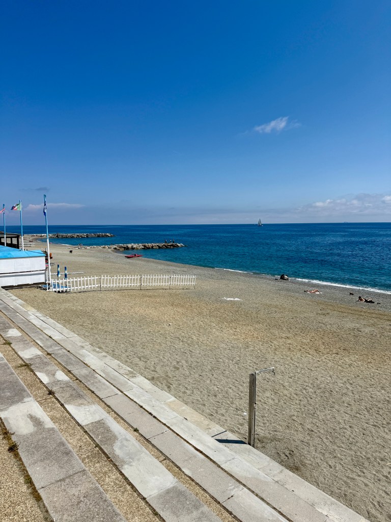 We joined the coastal road and drove alongside the huge industrial port of Vado and through the busy streets of the semi industrial towns of Vado Ligure and Savona (neither place offering anywhere sensible and safe to park) and were soon parked up in our Aire for the night in Albisola Marina, about half a mile from the sea front and after a brief chill that is exactly where we headed.