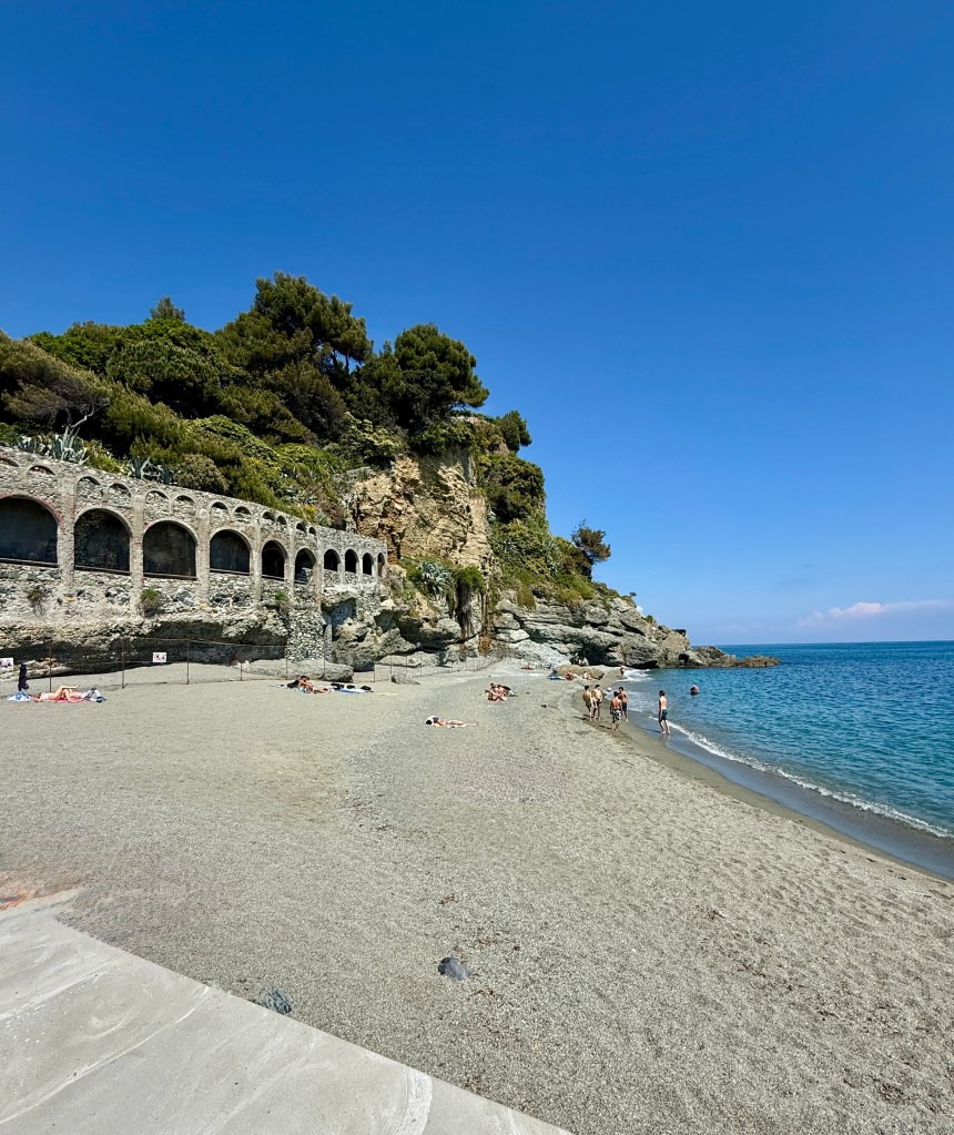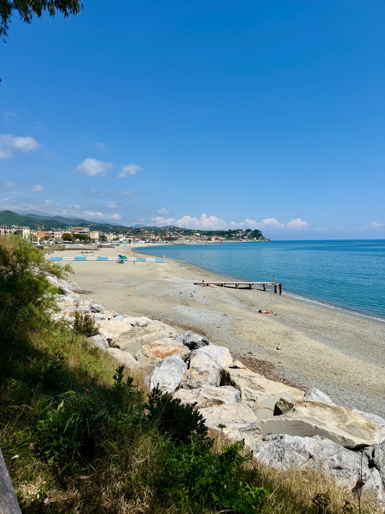 At this point we headed back the way we came, crossing the river that divides the two villages and crossing into Albisola Superiore to enjoy a stroll along the thankfully paved promenade, passing the main beach Spaiggia Albisola Superiore and down onto the l’ultimo Spiaggia Abisola to find a little bit of shade for Tilly behind some rocks….