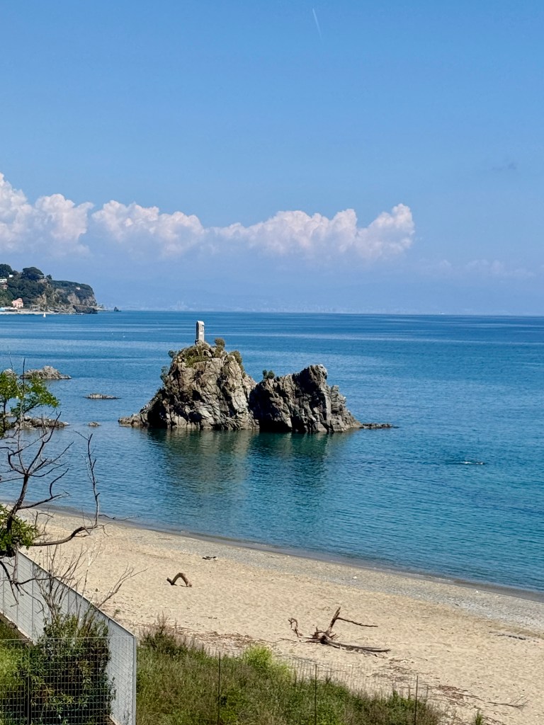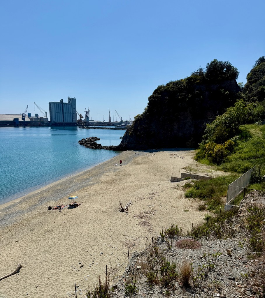 A sort of sand / gravel mix with plenty of space for everyone but with a mix of manicured private sections and only a little patch of dog friendly beach at this far end. After a little off lead time, we continued to walk towards Savona to catch the little Spiaggia delle Madonetta, with the rocky outcrop housing the Madonna Shrine and Albisola as a backdrop in one direction and the Port in the other….