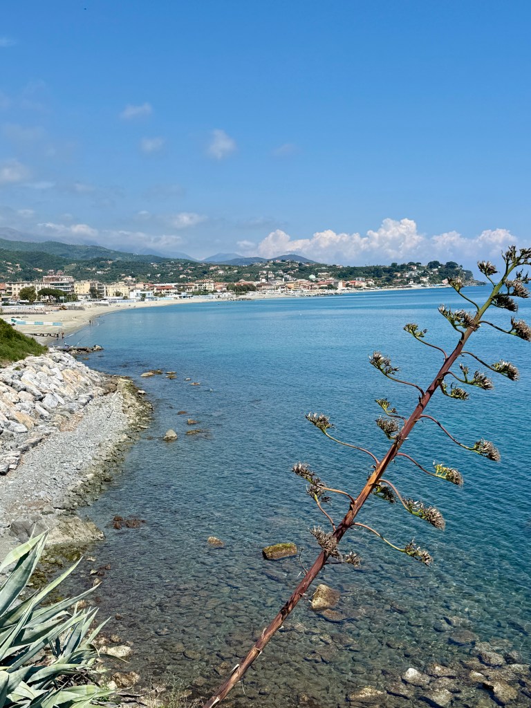 Arriving at the sea front fairly centrally we opted to walk back the way we had driven along the brightly coloured mosaic promenade (which in the bright sunlight was a little dazzling) of Albisola Marina to the far end of the beach….