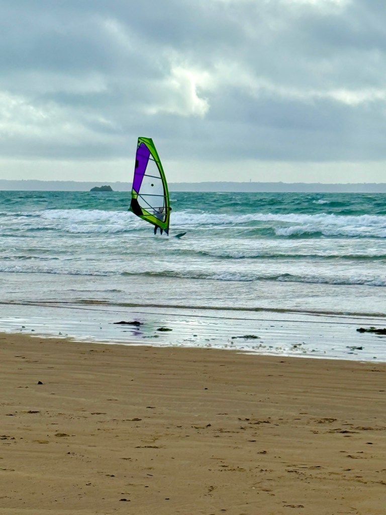This beach was dog friendly so we took the opportunity for a little play around as the clouds are beginning to gather again. Next stop was the long sandy beach – Plage de l’Aber and watched a while as a lone windsurfer made his way up and down the beach in the brisk winds….